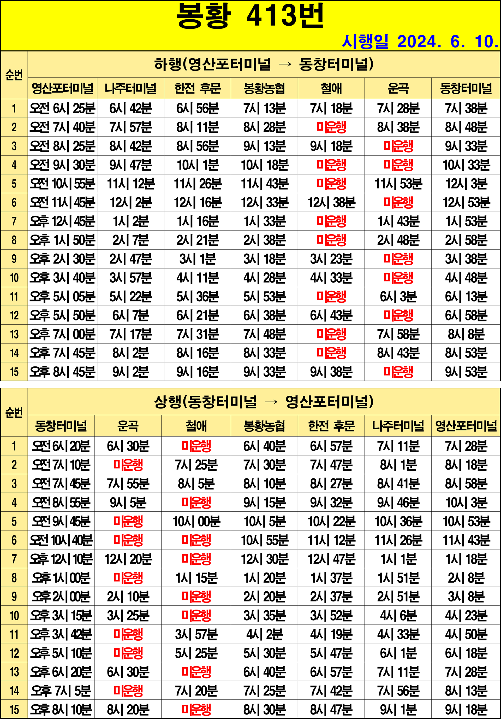 나주 413번(운곡): 1.동창터미널(기점) → 2.신창 → 3.덕림 → 4.오림 → 5.멧돌바위 → 6.월곡 → 7.용정 → 8.운곡1구 → 9.운곡 → 10.창용 → 11.미륵사입구 → 12.봉황농공단지 → 13.철야 → 14.망골 → 15.봉황면행정복지센터(남) → 16.봉황농협 → 17.봉황면행정복지센터(동) → 18.구석삼거리 → 19.대실 → 20.두함 → 21.두함입구 → 22.관전 → 23.장성 → 24.락동 → 25.옥산보건지소 → 26.옥산 → 27.신갈마을 → 28.갈산 → 29.토담휴로스 → 30.스카이센트럴 → 31.NH아동병원 → 32.사학연금공단 → 33.한전후문 → 34.전력거래소 → 35.한국농촌경제연구원 → 36.효사랑병원.삼진종합앞 → 37.촌곡.배박물관 → 38.남양유업 → 39.금천사거리.광탄마을 → 40.원촌 → 41.나주터미널(상행) → 42.성북아파트 → 43.천주교사거리 → 44.나주고교 → 45.소방삼거리 → 46.나주문화예술회관 → 47.흥룡마을입구 → 48.나주시청 → 49.나주교육지원청 → 50.대덕아파트 → 51.영강사거리 → 52.노인복지관 → 53.이창사거리.남교동 → 54.영산포터미널(상행)(회차지) → 55.영산포터미널(하행) → 56.이창사거리.남교동 → 57.노인복지관 → 58.영강사거리.영산대교 → 59.대덕아파트 → 60.나주시청 → 61.나주문화예술회관 → 62.송월부영아파트 → 63.소방삼거리 → 64.나주고교 → 65.백민원 → 66.천주교사거리 → 67.나주중앙병원 → 68.나주터미널(하행) → 69.교통센터 → 70.미곡 → 71.금천사거리.광탄마을 → 72.남양유업 → 73.촌곡.배박물관 → 74.효사랑병원.삼진종합앞 → 75.전력거래소 → 76.한전후문 → 77.사학연금공단 → 78.KPS → 79.스카이센트럴 → 80.토담휴로스 → 81.갈산 → 82.신갈마을 → 83.옥산 → 84.옥산보건지소 → 85.락동 → 86.장성 → 87.관전 → 88.두함입구 → 89.두함 → 90.대실 → 91.구석삼거리 → 92.봉황면행정복지센터(동) → 93.봉황농협 → 94.망골 → 95.철야 → 96.봉황농공단지 → 97.미륵사입구 → 98.창용 → 99.멧돌바위 → 100.월곡 → 101.용정 → 102.운곡1구 → 103.운곡 → 104.멧돌바위 → 105.오림 → 106.덕림 → 107.신창 → 108.동창터미널(종점)