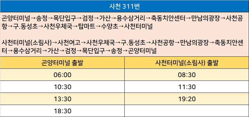 사천 311번: 곤양터미널→송정→목단입구→검정→가산→용수삼거리→축동치안센터→만남의광장→사천공항→구.동성초→사천우체국→탑마트→수양초→사천터미널 / 사천터미널(소림사)→사천여고→사천우체국→구.동성초→사천공항→만남의광장→축동치안센터→용수삼거리→가산→검정→목단입구→송정→곤양터미널