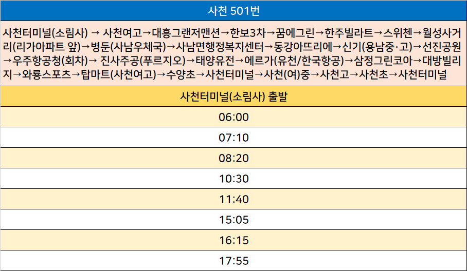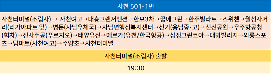 사천 501-1번: 사천터미널(소림사) → 사천여고→대흥그랜저맨션→한보3차→꿈에그린→한주빌라트→스위첸→월성사거리(리가아파트 앞)→병둔(사남우체국)→사남면행정복지센터→신기(용남중·고)→선진공원→우주항공청(회차)→진사주공(푸르지오)→태양유전→에르가(유천/한국항공)→삼정그린코아→대방빌리지→와룡스포츠→탑마트(사천여고)→수양초→사천터미널