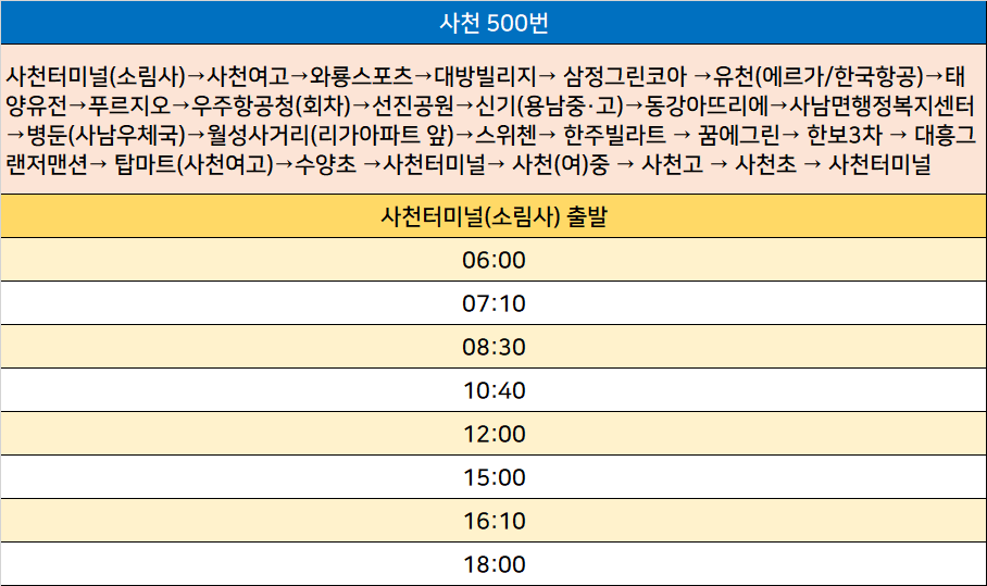 사천 500-1번: 사천터미널(소림사)→사천여고→와룡스포츠→대방빌리지→삼정그린코아 →유천(에르가/한국항공)→태양유전→푸르지오→우주항공청(회차)→선진공원→신기(용남중·고)→사남면행정복지센터→병둔(사남우체국)→월성사거리(리가아파트 앞)→스위첸→ 한주빌라트→ 꿈에그린→한보3차 →대흥그랜저맨션→ 탑마트(사천여고)→ 수양초 →사천터미널