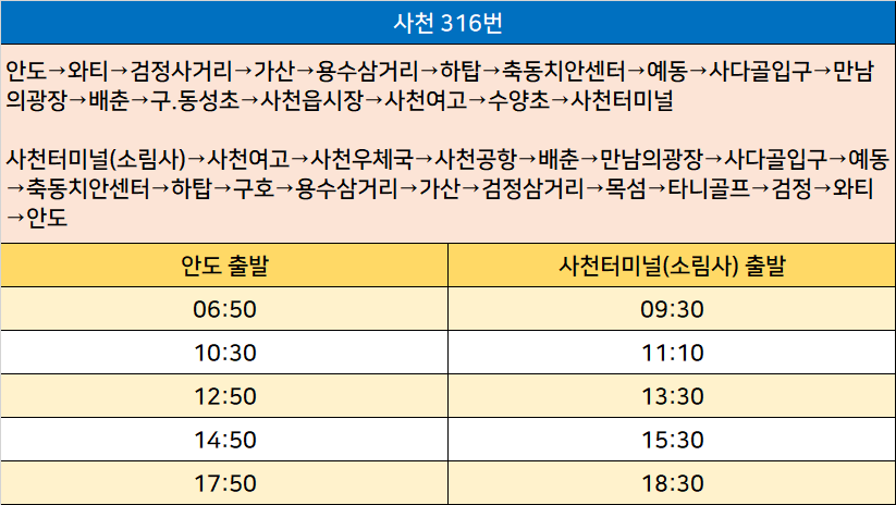 사천 316번: 안도→와티→검정사거리→가산→용수삼거리→하탑→축동치안센터→예동→사다골입구→만남의광장→배춘→구.동성초→사천읍시장→사천여고→수양초→사천터미널 / 사천터미널(소림사)→사천여고→사천우체국→사천공항→배춘→만남의광장→사다골입구→예동→축동치안센터→하탑→구호→용수삼거리→가산→검정삼거리→목섬→타니골프→검정→와티→안도