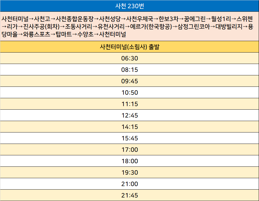 사천 230번: 사천터미널→사천고→사천종합운동장→사천성당→사천우체국→한보3차→꿈에그린→월성1리→스위첸→리가→진사주공(회차)→조동사거리→유천사거리→에르가(한국항공)→삼정그린코아→대방빌리지→용당마을→와룡스포츠→탑마트→수양초→사천터미널