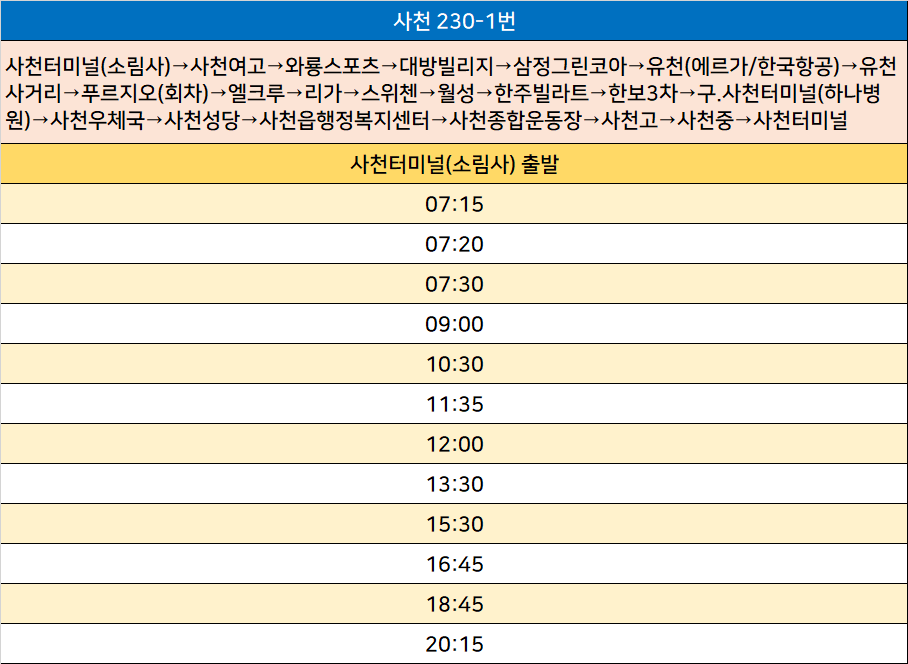 사천 230-1번: 사천터미널(소림사)→사천여고→와룡스포츠→대방빌리지→삼정그린코아→유천(에르가/한국항공)→유천사거리→푸르지오(회차)→엘크루→리가→스위첸→월성→한주빌라트→한보3차→구.사천터미널(하나병원)→사천우체국→사천성당→사천읍행정복지센터→사천종합운동장→사천고→사천중→사천터미널