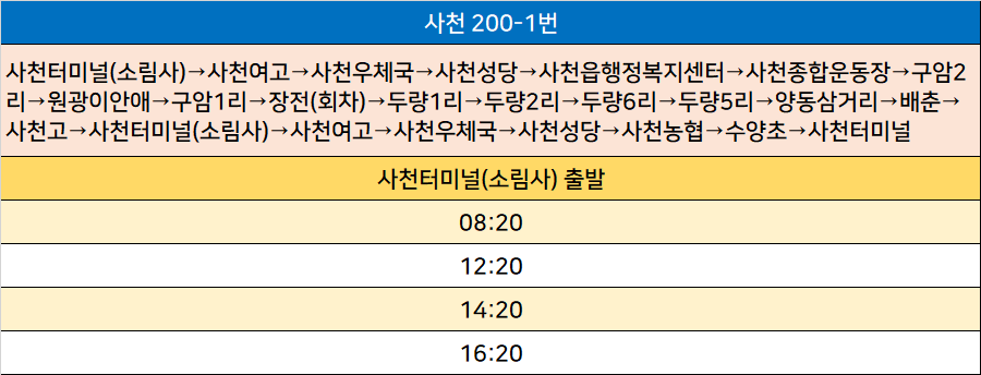 사천 200-1번: 사천터미널(소림사)→사천여고→사천우체국→사천성당→사천읍행정복지센터→사천종합운동장→구암2리→원광이안애→구암1리→장전(회차)→두량1리→두량2리→두량6리→두량5리→양동삼거리→배춘→사천고→사천터미널(소림사)→사천여고→사천우체국→사천성당→사천농협→수양초→사천터미널
