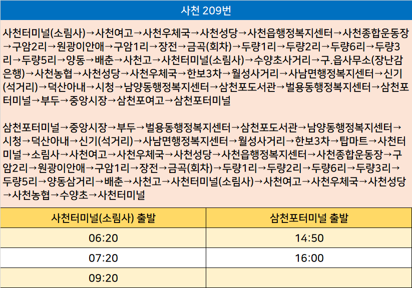 사천 209번: 사천터미널(소림사)→사천여고→사천우체국→사천성당→사천읍행정복지센터→사천종합운동장→구암2리→원광이안애→구암1리→장전→금곡(회차)→두량1리→두량2리→두량6리→두량3리→두량5리→양동→배춘→사천고→사천터미널(소림사)→수양초사거리→구.읍사무소(장난감은행)→사천농협→사천성당→사천우체국→한보3차→월성사거리→사남면행정복지센터→신기(석거리)→덕산아내→시청→남양동행정복지센터→삼천포도서관→벌용동행정복지센터→삼천포터미널→부두→중앙시장→삼천포여고→삼천포터미널 / 삼천포터미널→중앙시장→부두→벌용동행정복지센터→삼천포도서관→남양동행정복지센터→시청→덕산아내→신기(석거리)→사남면행정복지센터→월성사거리→한보3차→탑마트→사천터미널→소림사→사천여고→사천우체국→사천성당→사천읍행정복지센터→사천종합운동장→구암2리→원광이안애→구암1리→장전→금곡(회차)→두량1리→두량2리→두량6리→두량3리→두량5리→양동삼거리→배춘→사천고→사천터미널(소림사)→사천여고→사천우체국→사천성당→사천농협→수양초→사천터미널