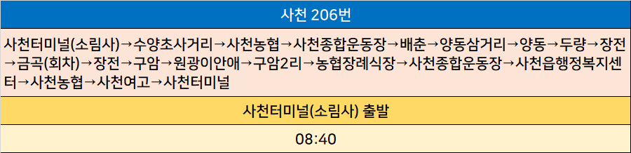 사천 206번: 사천터미널(소림사)→수양초사거리→사천농협→사천종합운동장→배춘→양동삼거리→양동→두량→장전→금곡(회차)→장전→구암→원광이안애→구암2리→농협장례식장→사천종합운동장→사천읍행정복지센터→사천농협→사천여고→사천터미널