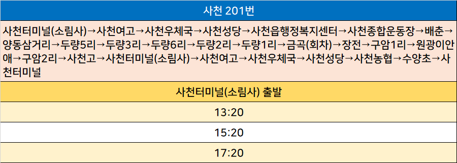 사천 201번: 사천터미널(소림사)→사천여고→사천우체국→사천성당→사천읍행정복지센터→사천종합운동장→배춘→양동삼거리→두량5리→두량3리→두량6리→두량2리→두량1리→금곡(회차)→장전→구암1리→원광이안애→구암2리→사천고→사천터미널(소림사)→사천여고→사천우체국→사천성당→사천농협→수양초→사천터미널