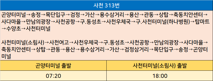 사천 313번: 곤양터미널→송정→목단입구→검정→가산→용수삼거리→용산→관동→상탑→축동치안센터→사다마을→만남의광장→사천공항→구.동성초→사천우체국→구.사천터미널(하나병원)→탑마트→수양초→사천터미널 / 사천터미널(소림사)→사천여고→사천우체국→구.동성초→사천공항→만남의광장→사다마을→축동치안센터→상탑→관동→용산→용수삼거리→가산→검정삼거리→목단입구→송정→곤양터미널