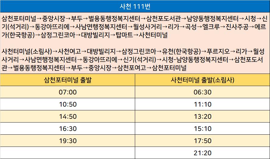 사천 111번: 삼천포터미널→중앙시장→부두→벌용동행정복지센터→삼천포도서관→남양동행정복지센터→시청→신기(석거리)→동강아뜨리에→사남면행정복지센터→월성사거리→리가→곡성→엘크루→진사주공→에르가(한국항공)→삼정그린코아→대방빌리지→탑마트→사천터미널 / 사천터미널(소림사)→사천여고→대방빌리지→삼정그린코아→유천(한국항공)→푸르지오→리가→월성사거리→사남면행정복지센터→동강아뜨리에→신기(석거리)→시청-남양동행정복지센터→삼천포도서관→벌용동행정복지센터→부두→중앙시장→삼천포여고→삼천포터미널