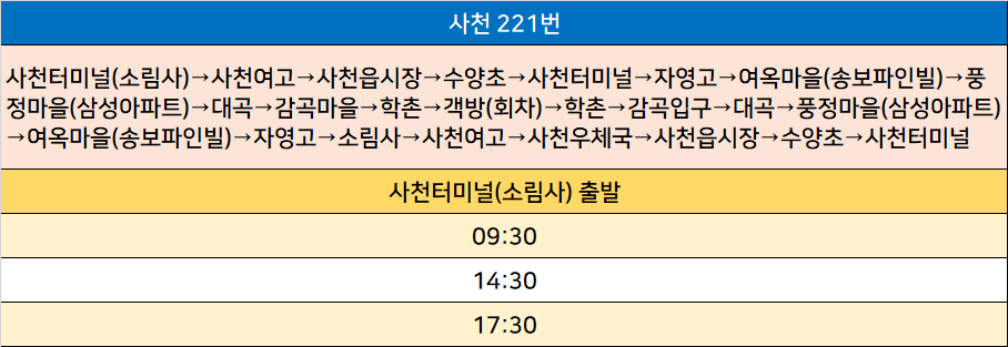 사천 221번: 사천터미널(소림사)→사천여고→사천읍시장→수양초→사천터미널→자영고→여옥마을(송보파인빌)→풍정마을(삼성아파트)→대곡→감곡마을→학촌→객방(회차)→학촌→감곡입구→대곡→풍정마을(삼성아파트)→여옥마을(송보파인빌)→자영고→소림사→사천여고→사천우체국→사천읍시장→수양초→사천터미널
