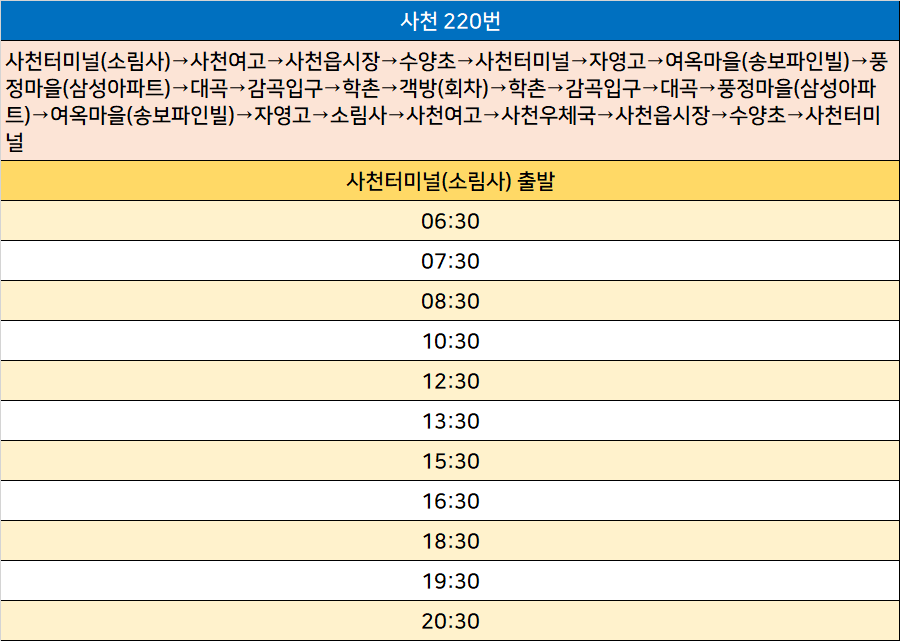 사천 220번: 사천터미널(소림사)→사천여고→사천읍시장→수양초→사천터미널→자영고→여옥마을(송보파인빌)→풍정마을(삼성아파트)→대곡→감곡입구→학촌→객방(회차)→학촌→감곡입구→대곡→풍정마을(삼성아파트)→여옥마을(송보파인빌)→자영고→소림사→사천여고→사천우체국→사천읍시장→수양초→사천터미널