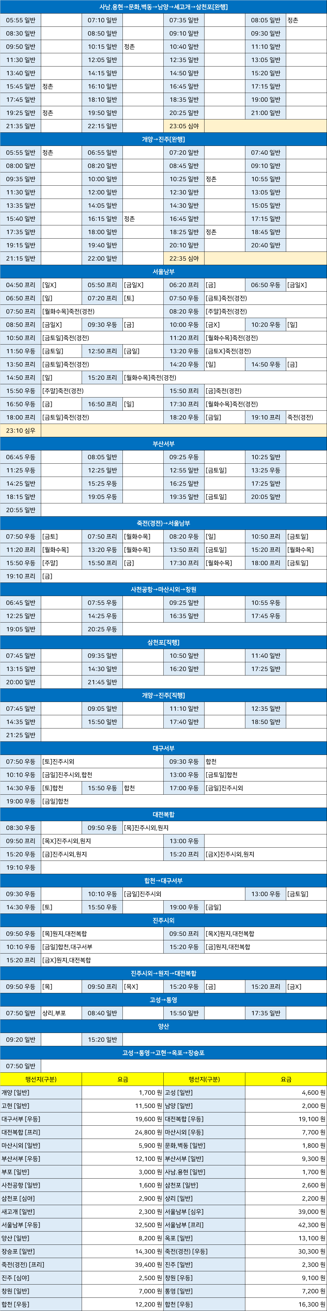 사천 시외버스 터미널 시간표/요금표 2025년 03월 31일 기준