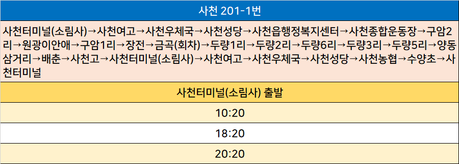 사천 201-1번: 사천터미널(소림사)→사천여고→사천우체국→사천성당→사천읍행정복지센터→사천종합운동장→구암2리→원광이안애→구암1리→장전→금곡(회차)→두량1리→두량2리→두량6리→두량3리→두량5리→양동삼거리→배춘→사천고→사천터미널(소림사)→사천여고→사천우체국→사천성당→사천농협→수양초→사천터미널