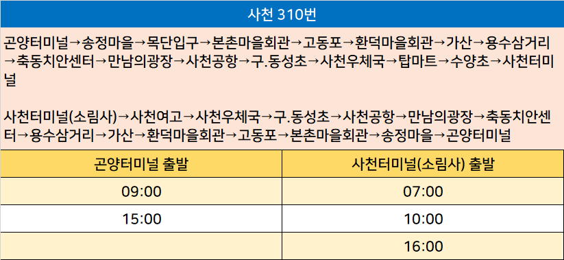사천 310번: 곤양터미널→송정마을→목단입구→본촌마을회관→고동포→환덕마을회관→가산→용수삼거리→축동치안센터→만남의광장→사천공항→구.동성초→사천우체국→탑마트→수양초→사천터미널 / 사천터미널(소림사)→사천여고→사천우체국→구.동성초→사천공항→만남의광장→축동치안센터→용수삼거리→가산→환덕마을회관→고동포→본촌마을회관→송정마을→곤양터미널