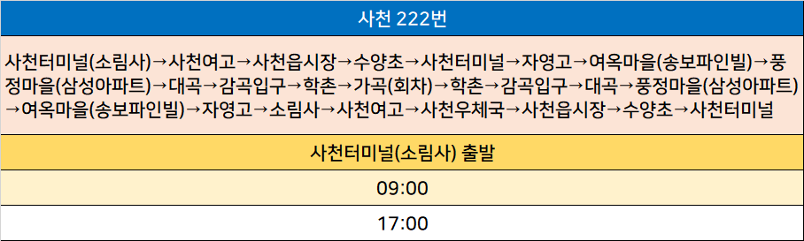 사천 222번: 사천터미널(소림사)→사천여고→사천읍시장→수양초→사천터미널→자영고→여옥마을(송보파인빌)→풍정마을(삼성아파트)→대곡→감곡입구→학촌→가곡(회차)→학촌→감곡입구→대곡→풍정마을(삼성아파트)→여옥마을(송보파인빌)→자영고→소림사→사천여고→사천우체국→사천읍시장→수양초→사천터미널