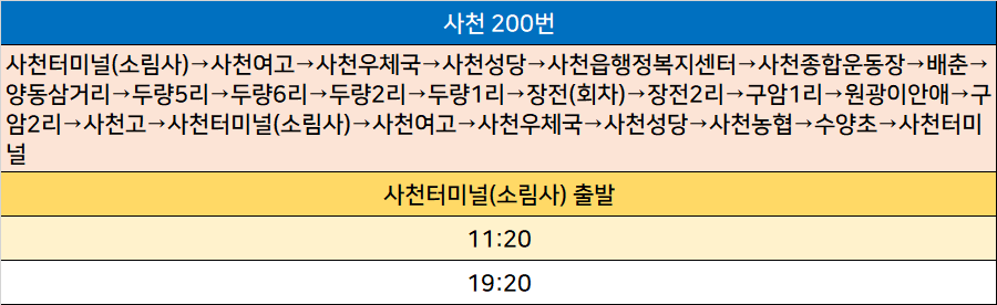 사천 200번: 사천터미널(소림사)→사천여고→사천우체국→사천성당→사천읍행정복지센터→사천종합운동장→배춘→양동삼거리→두량5리→두량6리→두량2리→두량1리→장전(회차)→장전2리→구암1리→원광이안애→구암2리→사천고→사천터미널(소림사)→사천여고→사천우체국→사천성당→사천농협→수양초→사천터미널
