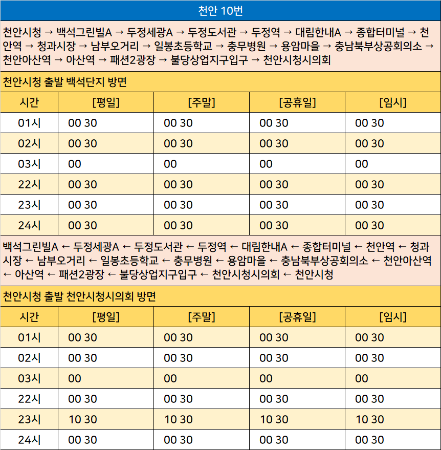 천안 10번: 천안시청 → 백석그린빌A → 두정세광A → 두정도서관 → 두정역 → 대림한내A → 종합터미널 → 천안역 → 청과시장 → 남부오거리 → 일봉초등학교 → 충무병원 → 용암마을 → 충남북부상공회의소 → 천안아산역 → 아산역 → 패션2광장 → 불당상업지구입구 → 천안시청시의회 / 백석그린빌A ← 두정세광A ← 두정도서관 ← 두정역 ← 대림한내A ← 종합터미널 ← 천안역 ← 청과시장 ← 남부오거리 ← 일봉초등학교 ← 충무병원 ← 용암마을 ← 충남북부상공회의소 ← 천안아산역 ← 아산역 ← 패션2광장 ← 불당상업지구입구 ← 천안시청시의회 ← 천안시청