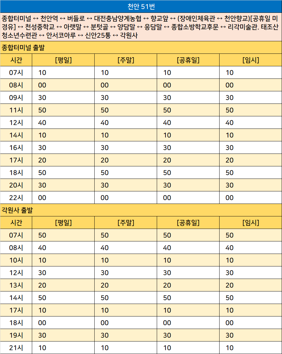 천안 51번: 종합터미널 ↔ 천안역 ↔ 버들로 ↔ 대전충남양계농협 ↔ 향교앞 ↔ (장애인체육관 ↔ 천안향교)[공휴일 미경유] ↔ 천성중학교 ↔ 아랫말 ↔ 분텃골 ↔ 양담말 ↔ 응담말 ↔ 종합소방학교후문 ↔ 리각미술관. 태조산청소년수련관 ↔ 안서코아루 ↔ 신안25통 ↔ 각원사