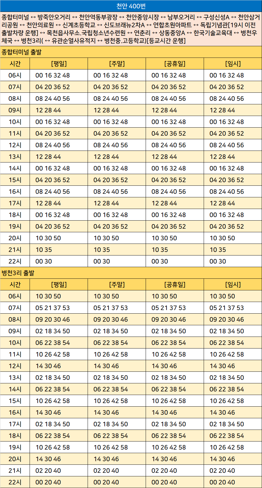 천안 400번: 종합터미널 ↔ 방죽안오거리 ↔ 천안역동부광장 ↔ 천안중앙시장 ↔ 남부오거리 ↔ 구성신성A ↔ 천안삼거리공원 ↔ 천안의료원 ↔ 신계초등학교 ↔ 신도브래뉴2차A ↔ 연합초원아파트 ↔ 독립기념관[19시 이전 출발차량 운행] ↔ 목천읍사무소.국립청소년수련원 ↔ 연춘리 ↔ 상동중앙A ↔ 한국기술교육대 ↔ 병천우체국 ↔ 병천3리( ↔ 유관순열사유적지 ↔ 병천중.고등학교)[등교시간 운행]