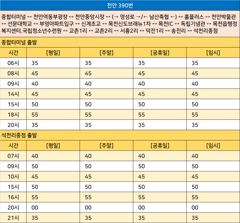 천안 390번: 종합터미널 ↔ 천안역동부광장 ↔ 천안중앙시장 ↔ (→ 영성로 →/← 남산축협 ←) ↔ 홈플러스 ↔ 천안박물관 ↔ 선문대학교 ↔ 부영아파트입구 ↔ 신계초교 ↔ 목천신도브래뉴1차 ↔ 목천IC ↔ 독립기념관 ↔ 목천읍행정복지센터.국립청소년수련원 ↔ 교촌1리 ↔ 교촌2리 ↔ 서흥2리 ↔ 덕전1리 ↔ 송전리 ↔ 석천리종점