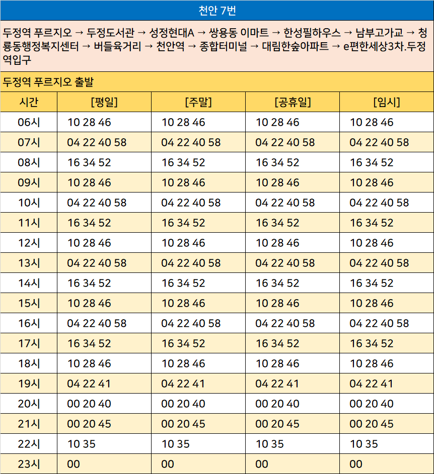 천안 7번: 두정역 푸르지오 → 두정도서관 → 성정현대A → 쌍용동 이마트 → 한성필하우스 → 남부고가교 → 청룡동행정복지센터 → 버들육거리 → 천안역 → 종합터미널 → 대림한숲아파트 → e편한세상3차.두정역입구