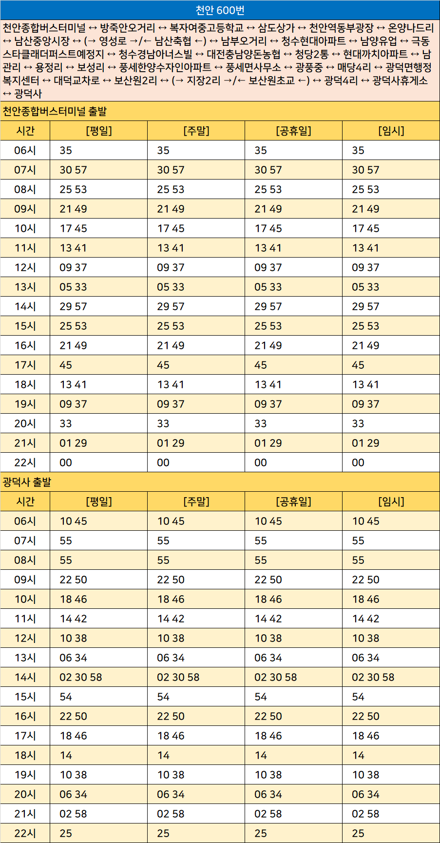 천안 600번: 천안종합버스터미널 ↔ 방죽안오거리 ↔ 복자여중고등학교 ↔ 삼도상가 ↔ 천안역동부광장 ↔ 온양나드리 ↔ 남산중앙시장 ↔ (→ 영성로 →/← 남산축협 ←) ↔ 남부오거리 ↔ 청수현대아파트 ↔ 남양유업 ↔ 극동스타클래더퍼스트예정지 ↔ 청수경남아너스빌 ↔ 대전충남양돈농협 ↔ 청당2통 ↔ 현대까치아파트 ↔ 남관리 ↔ 용정리 ↔ 보성리 ↔ 풍세한양수자인아파트 ↔ 풍세면사무소 ↔ 광풍중 ↔ 매당4리 ↔ 광덕면행정복지센터 ↔ 대덕교차로 ↔ 보산원2리 ↔ (→ 지장2리 →/← 보산원초교 ←) ↔ 광덕4리 ↔ 광덕사휴게소 ↔ 광덕사