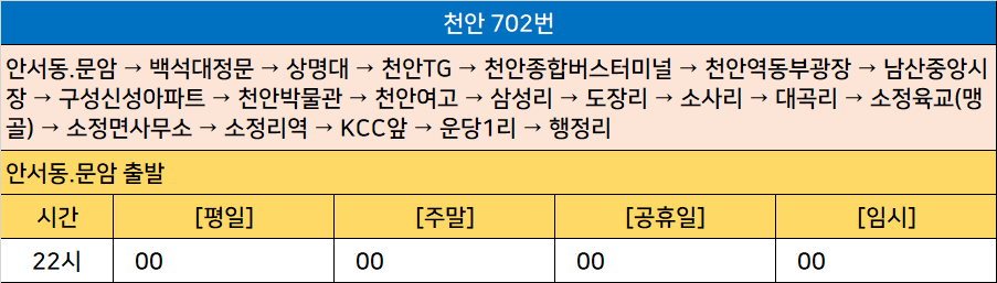 천안 702번: 안서동.문암 → 백석대정문 → 상명대 → 천안TG → 천안종합버스터미널 → 천안역동부광장 → 남산중앙시장 → 구성신성아파트 → 천안박물관 → 천안여고 → 삼성리 → 도장리 → 소사리 → 대곡리 → 소정육교(맹골) → 소정면사무소 → 소정리역 → KCC앞 → 운당1리 → 행정리