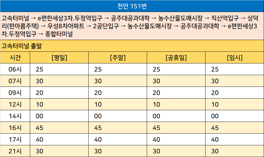 천안 151번: 고속터미널 → e편한세상3차.두정역입구 → 공주대공과대학 → 농수산물도매시장 → 직산역입구 → 상덕리(한아름주택) → 우성8차아파트 → 2공단입구 → 농수산물도매시장 → 공주대공과대학 → e편한세상3차.두정역입구 → 종합터미널
