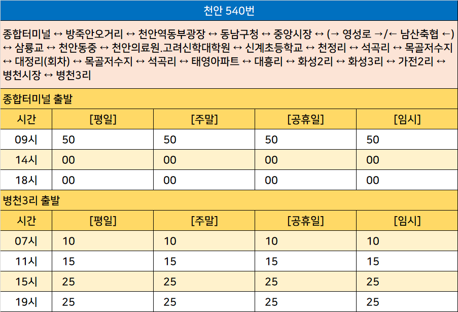 천안 540번: 종합터미널 ↔ 방죽안오거리 ↔ 천안역동부광장 ↔ 동남구청 ↔ 중앙시장 ↔ (→ 영성로 →/← 남산축협 ←) ↔ 삼룡교 ↔ 천안동중 ↔ 천안의료원.고려신학대학원 ↔ 신계초등학교 ↔ 천정리 ↔ 석곡리 ↔ 목골저수지 ↔ 대정리(회차) ↔ 목골저수지 ↔ 석곡리 ↔ 태영아파트 ↔ 대흥리 ↔ 화성2리 ↔ 화성3리 ↔ 가전2리 ↔ 병천시장 ↔ 병천3리