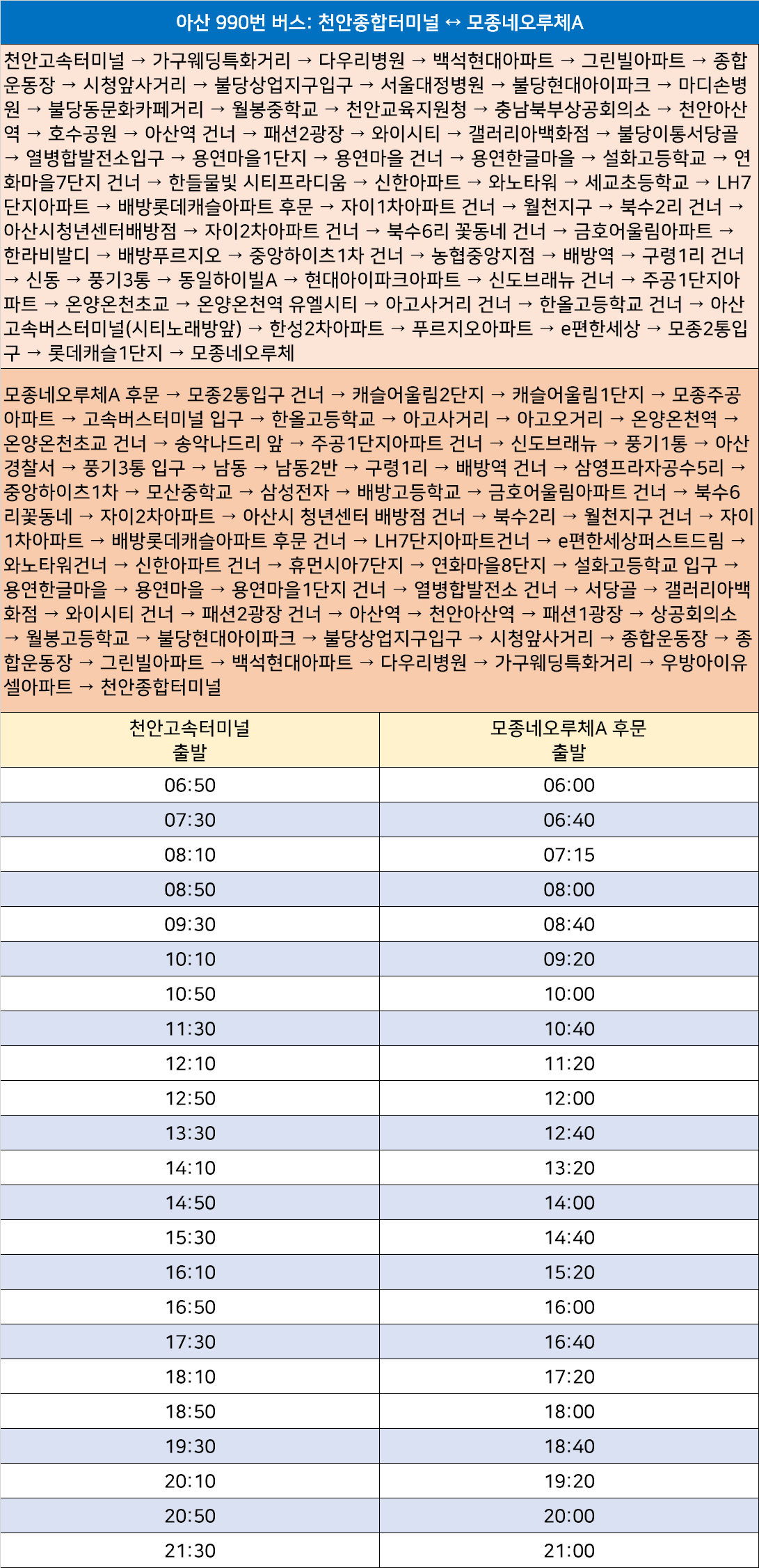 아산 990번 버스: 천안종합터미널 ↔ 모종네오루체A 모종