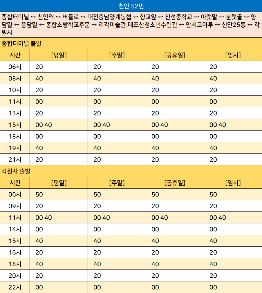 천안 52번: 종합터미널 ↔ 천안역 ↔ 버들로 ↔ 대전충남양계농협 ↔ 향교앞 ↔ 천성중학교 ↔ 아랫말 ↔ 분텃골 ↔ 양담말 ↔ 응담말 ↔ 종합소방학교후문 ↔ 리각미술관.태조산청소년수련관 ↔ 안서코아루 ↔ 신안25통 ↔ 각원사