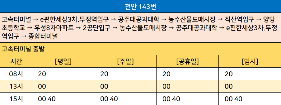 천안 143번: 고속터미널 → e편한세상3차.두정역입구 → 공주대공과대학 → 농수산물도매시장 → 직산역입구 → 양당초등학교 → 우성8차아파트 → 2공단입구 → 농수산물도매시장 → 공주대공과대학 → e편한세상3차.두정역입구 → 종합터미널