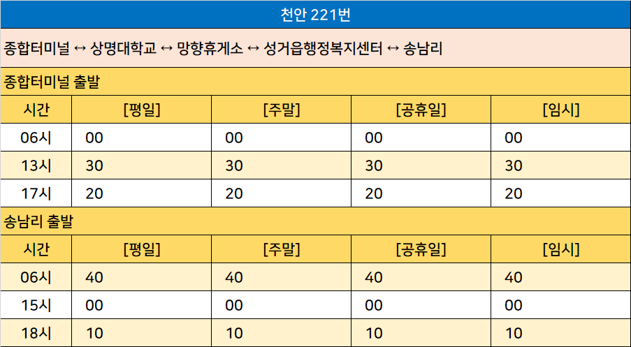 천안 221번: 종합터미널 ↔ 상명대학교 ↔ 망향휴게소 ↔ 성거읍행정복지센터 ↔ 송남리