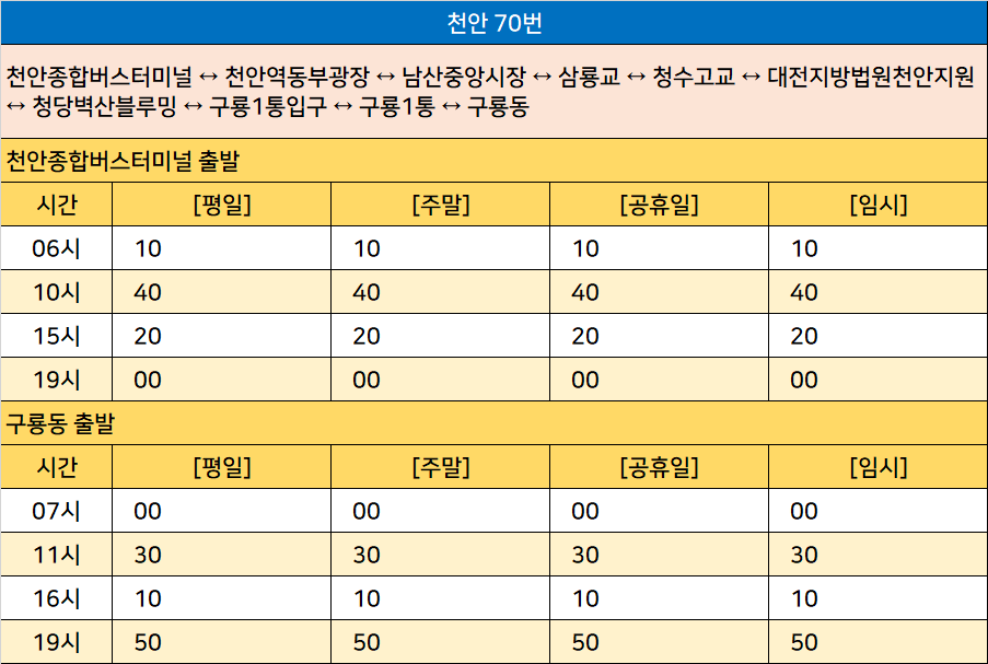 천안 70번: 천안종합버스터미널 ↔ 천안역동부광장 ↔ 남산중앙시장 ↔ 삼룡교 ↔ 청수고교 ↔ 대전지방법원천안지원 ↔ 청당벽산블루밍 ↔ 구룡1통입구 ↔ 구룡1통 ↔ 구룡동