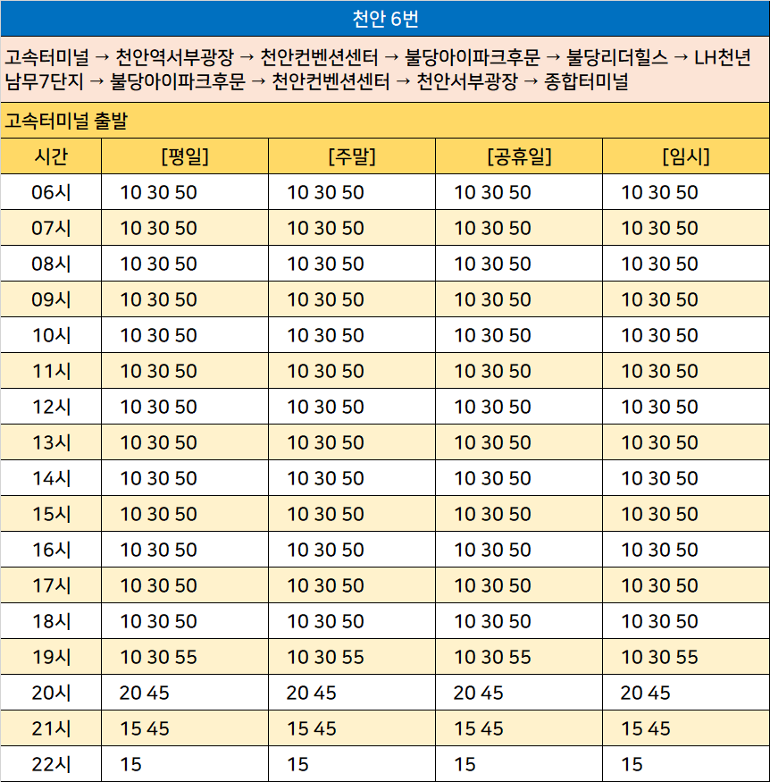 천안 6번: 고속터미널 → 천안역서부광장 → 천안컨벤션센터 → 불당아이파크후문 → 불당리더힐스 → LH천년남무7단지 → 불당아이파크후문 → 천안컨벤션센터 → 천안서부광장 → 종합터미널