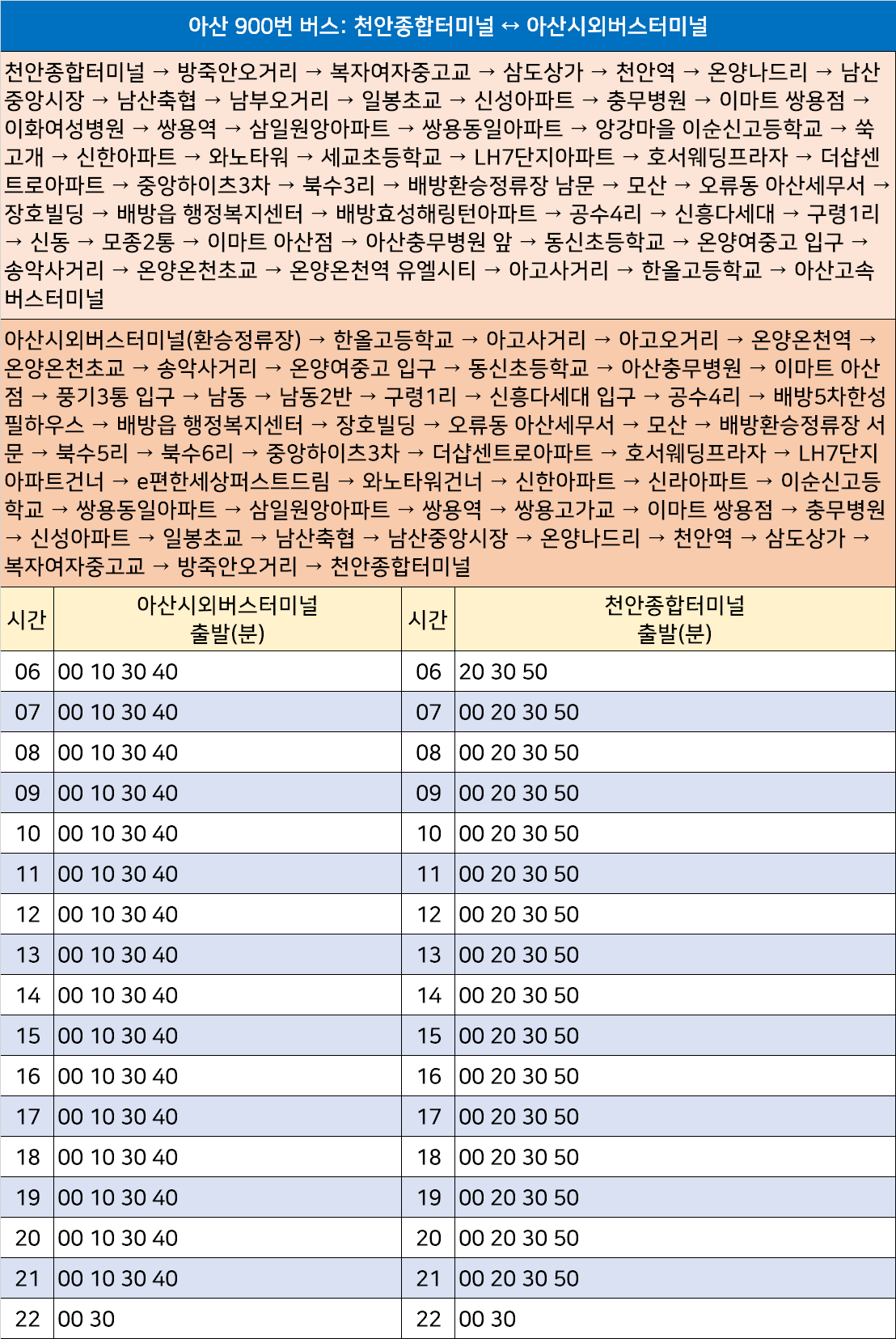 천안 900번: 아산시외버스터미널(환승정류장) ↔ 온양온천역 ↔ 이마트아산점 ↔ 배방읍사무소 ↔ 호서웨딩프라자 ↔ 쑥고개 ↔ 쌍용동일A ↔ 쌍용역[쌍용역] ↔ 이마트쌍용점 ↔ 남부오거리 ↔ 남산중앙시장 ↔ 천안역.동부광장 ↔ 종합터미널