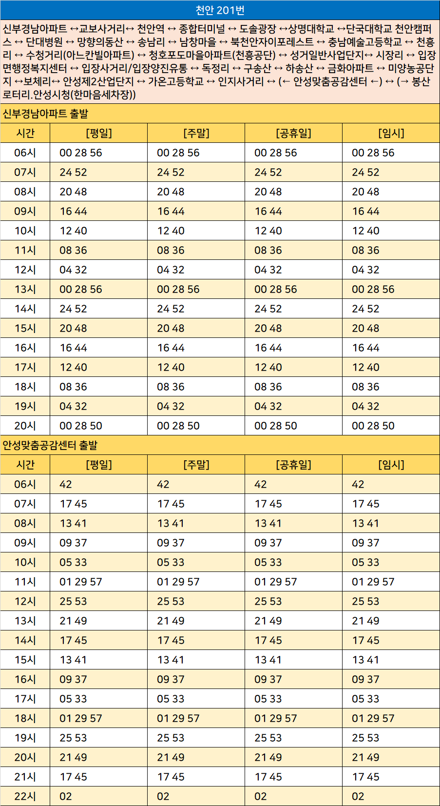 천안 201번: 신부경남아파트 ↔교보사거리↔ 천안역 ↔ 종합터미널 ↔ 도솔광장 ↔상명대학교 ↔단국대학교 천안캠퍼스 ↔ 단대병원 ↔ 망향의동산 ↔ 송남리 ↔ 남창마을 ↔ 북천안자이포레스트 ↔ 충남예술고등학교 ↔ 천흥리 ↔ 수청거리(아느칸빌아파트) ↔ 청호포도마을아파트(천흥공단) ↔ 성거일반사업단지↔ 시장리 ↔ 입장면행정복지센터 ↔ 입장사거리/입장양진유통 ↔ 독정리 ↔ 구송산 ↔ 하송산 ↔ 금화아파트 ↔ 미양농공단지 ↔보체리↔ 안성제2산업단지 ↔ 가온고등학교 ↔ 인지사거리 ↔ (← 안성맞춤공감센터 ←) ↔ (→ 봉산로터리.안성시청(한마음세차장))
