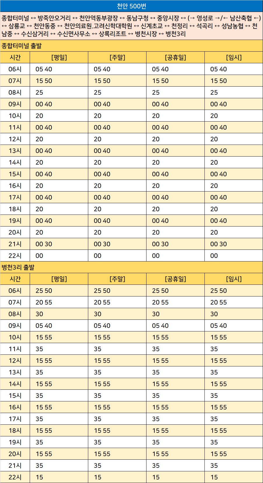 천안 500번: 종합터미널 ↔ 방죽안오거리 ↔ 천안역동부광장 ↔ 동남구청 ↔ 중앙시장 ↔ (→ 영성로 →/← 남산축협 ←) ↔ 삼룡교 ↔ 천안동중 ↔ 천안의료원.고려신학대학원 ↔ 신계초교 ↔ 천정리 ↔ 석곡리 ↔ 성남농협 ↔ 천남중 ↔ 수신삼거리 ↔ 수신면사무소 ↔ 상록리조트 ↔ 병천시장 ↔ 병천3리