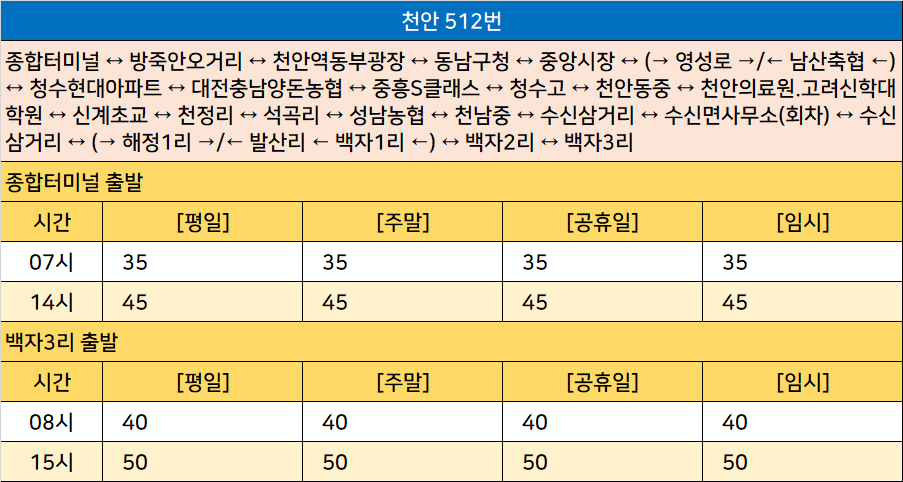 천안 512번: 종합터미널 ↔ 방죽안오거리 ↔ 천안역동부광장 ↔ 동남구청 ↔ 중앙시장 ↔ (→ 영성로 →/← 남산축협 ←) ↔ 청수현대아파트 ↔ 대전충남양돈농협 ↔ 중흥S클래스 ↔ 청수고 ↔ 천안동중 ↔ 천안의료원.고려신학대학원 ↔ 신계초교 ↔ 천정리 ↔ 석곡리 ↔ 성남농협 ↔ 천남중 ↔ 수신삼거리 ↔ 수신면사무소(회차) ↔ 수신삼거리 ↔ (→ 해정1리 →/← 발산리 ← 백자1리 ←) ↔ 백자2리 ↔ 백자3리