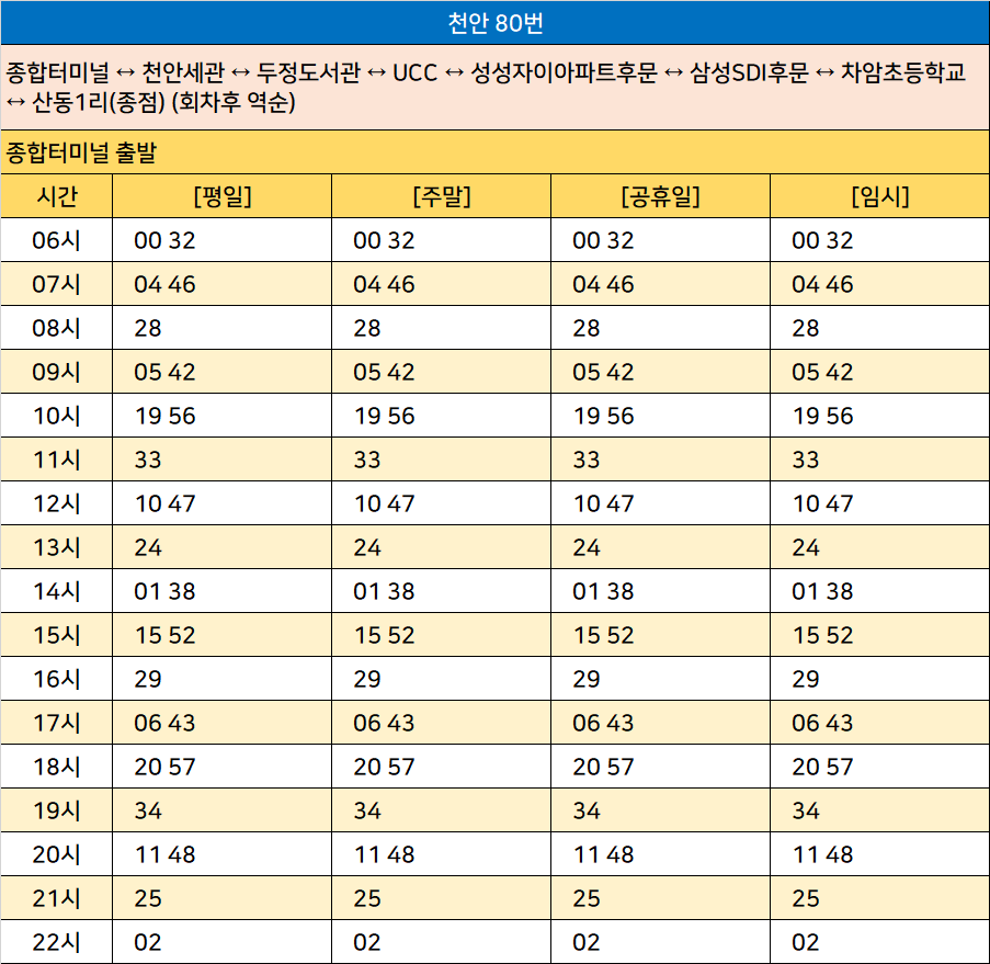 천안 80번: 종합터미널 ↔ 천안세관 ↔ 두정도서관 ↔ UCC ↔ 성성자이아파트후문 ↔ 삼성SDI후문 ↔ 차암초등학교 ↔ 산동1리(종점) (회차후 역순)