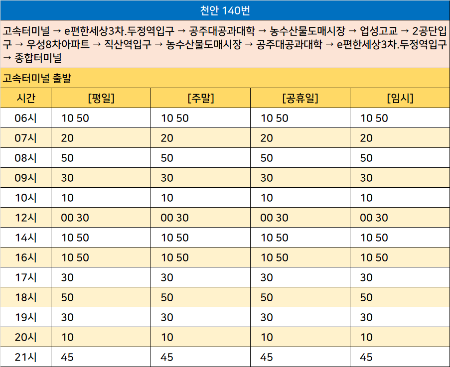 천안 140번: 고속터미널 → e편한세상3차.두정역입구 → 공주대공과대학 → 농수산물도매시장 → 업성고교 → 2공단입구 → 우성8차아파트 → 직산역입구 → 농수산물도매시장 → 공주대공과대학 → e편한세상3차.두정역입구 → 종합터미널