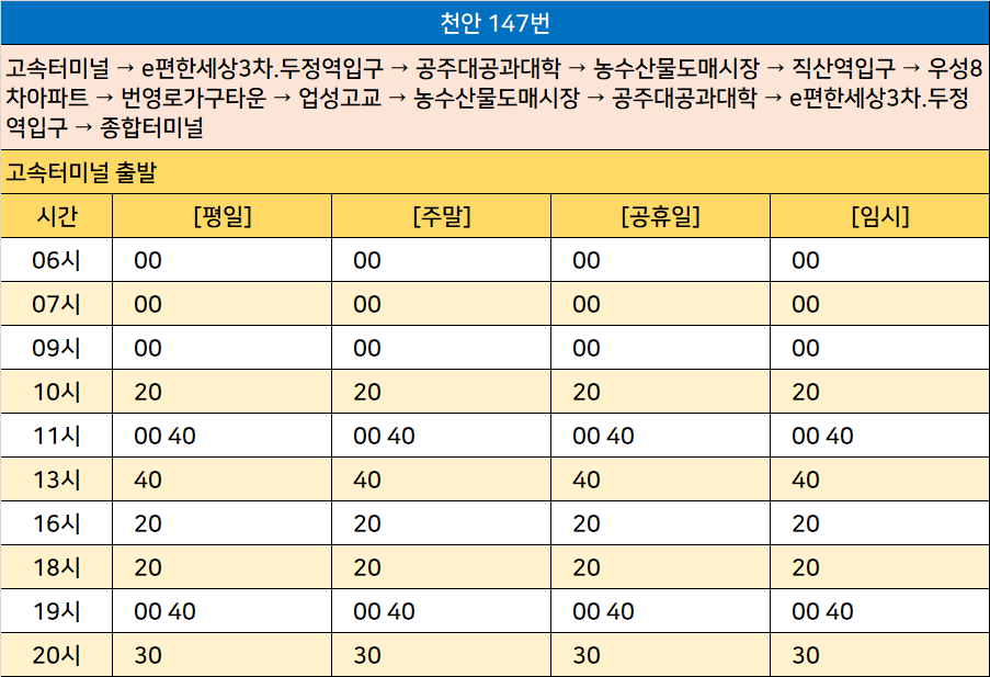 천안 147번: 고속터미널 → e편한세상3차.두정역입구 → 공주대공과대학 → 농수산물도매시장 → 직산역입구 → 우성8차아파트 → 번영로가구타운 → 업성고교 → 농수산물도매시장 → 공주대공과대학 → e편한세상3차.두정역입구 → 종합터미널