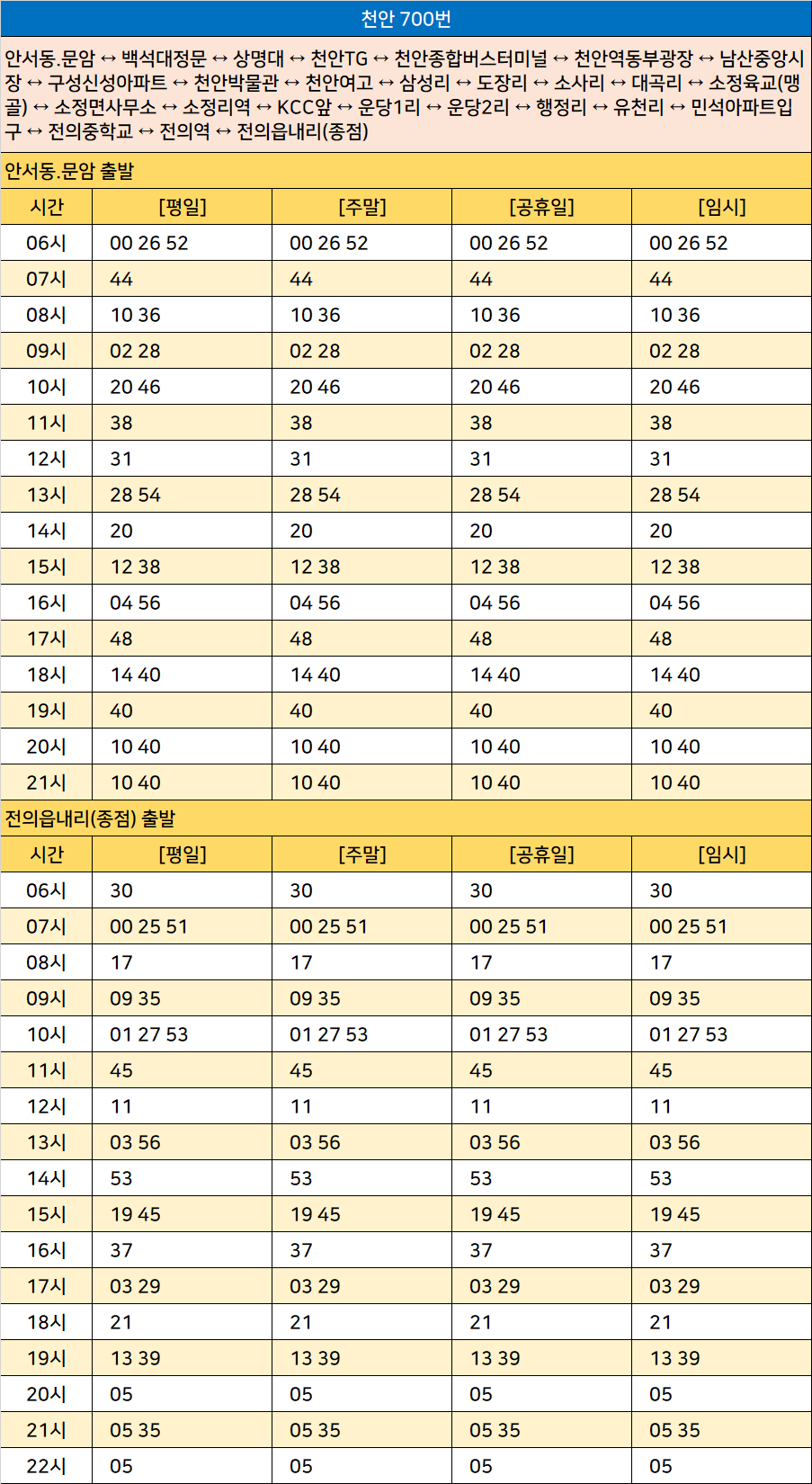 천안 700번: 안서동.문암 ↔ 백석대정문 ↔ 상명대 ↔ 천안TG ↔ 천안종합버스터미널 ↔ 천안역동부광장 ↔ 남산중앙시장 ↔ 구성신성아파트 ↔ 천안박물관 ↔ 천안여고 ↔ 삼성리 ↔ 도장리 ↔ 소사리 ↔ 대곡리 ↔ 소정육교(맹골) ↔ 소정면사무소 ↔ 소정리역 ↔ KCC앞 ↔ 운당1리 ↔ 운당2리 ↔ 행정리 ↔ 유천리 ↔ 민석아파트입구 ↔ 전의중학교 ↔ 전의역 ↔ 전의읍내리(종점)