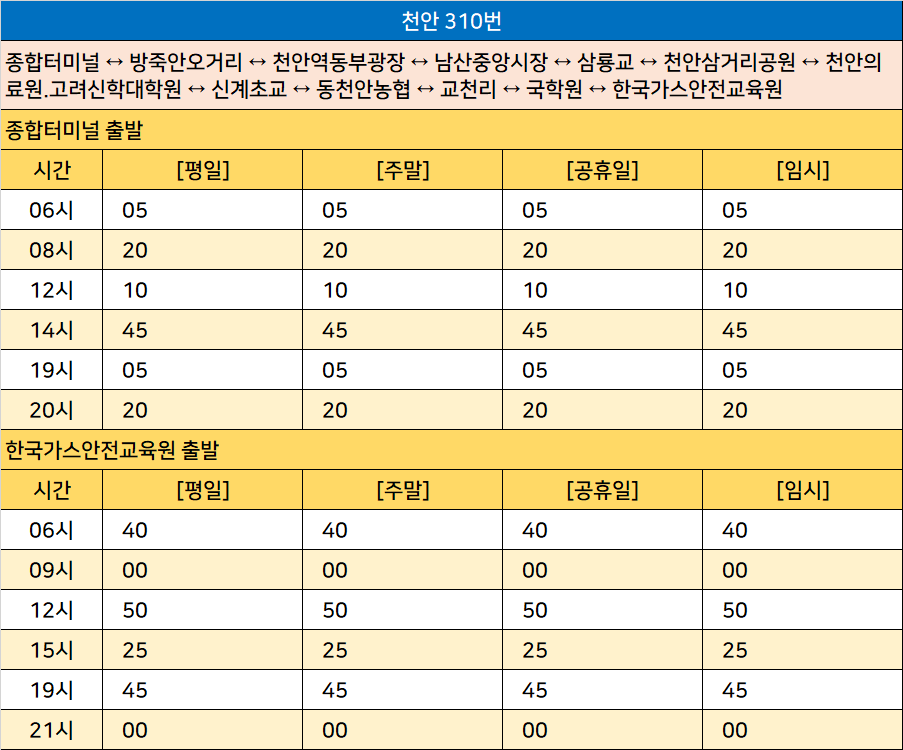 천안 310번: 종합터미널 ↔ 방죽안오거리 ↔ 천안역동부광장 ↔ 남산중앙시장 ↔ 삼룡교 ↔ 천안삼거리공원 ↔ 천안의료원.고려신학대학원 ↔ 신계초교 ↔ 동천안농협 ↔ 교천리 ↔ 국학원 ↔ 한국가스안전교육원