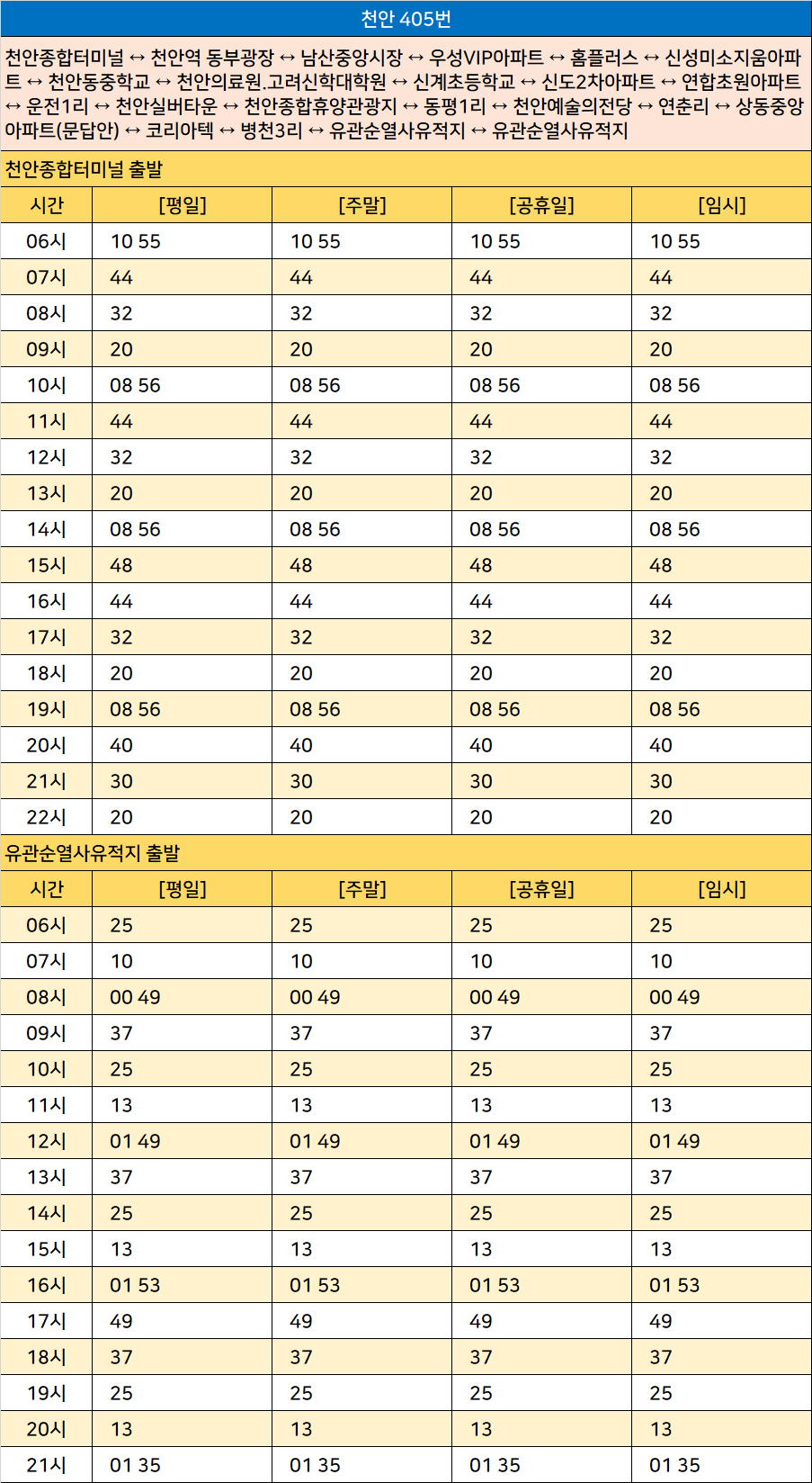 천안 405번: 천안종합터미널 ↔ 천안역 동부광장 ↔ 남산중앙시장 ↔ 우성VIP아파트 ↔ 홈플러스 ↔ 신성미소지움아파트 ↔ 천안동중학교 ↔ 천안의료원.고려신학대학원 ↔ 신계초등학교 ↔ 신도2차아파트 ↔ 연합초원아파트 ↔ 운전1리 ↔ 천안실버타운 ↔ 천안종합휴양관광지 ↔ 동평1리 ↔ 천안예술의전당 ↔ 연춘리 ↔ 상동중앙아파트(문답안) ↔ 코리아텍 ↔ 병천3리 ↔ 유관순열사유적지 ↔ 유관순열사유적지