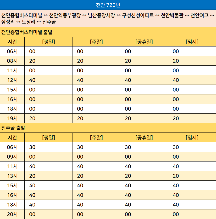천안 720번: 천안종합버스터미널 ↔ 천안역동부광장 ↔ 남산중앙시장 ↔ 구성신성아파트 ↔ 천안박물관 ↔ 천안여고 ↔ 삼성리 ↔ 도장리 ↔ 진주골