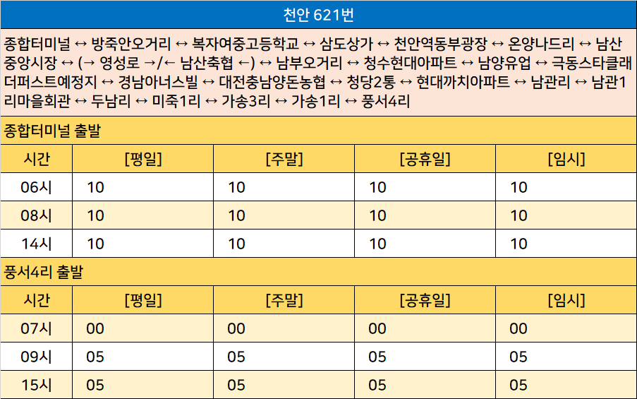 천안 621번: 종합터미널 ↔ 방죽안오거리 ↔ 복자여중고등학교 ↔ 삼도상가 ↔ 천안역동부광장 ↔ 온양나드리 ↔ 남산중앙시장 ↔ (→ 영성로 →/← 남산축협 ←) ↔ 남부오거리 ↔ 청수현대아파트 ↔ 남양유업 ↔ 극동스타클래더퍼스트예정지 ↔ 경남아너스빌 ↔ 대전충남양돈농협 ↔ 청당2통 ↔ 현대까치아파트 ↔ 남관리 ↔ 남관1리마을회관 ↔ 두남리 ↔ 미죽1리 ↔ 가송3리 ↔ 가송1리 ↔ 풍서4리