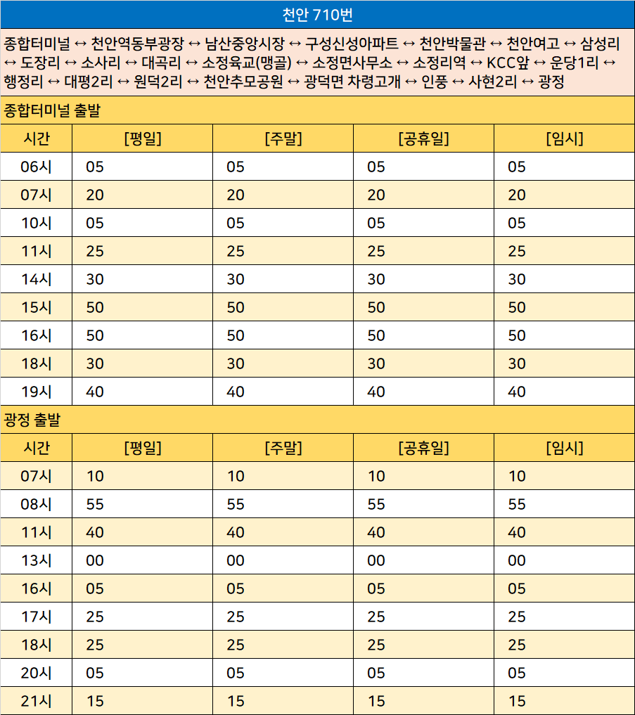 천안 710번: 종합터미널 ↔ 천안역동부광장 ↔ 남산중앙시장 ↔ 구성신성아파트 ↔ 천안박물관 ↔ 천안여고 ↔ 삼성리 ↔ 도장리 ↔ 소사리 ↔ 대곡리 ↔ 소정육교(맹골) ↔ 소정면사무소 ↔ 소정리역 ↔ KCC앞 ↔ 운당1리 ↔ 행정리 ↔ 대평2리 ↔ 원덕2리 ↔ 천안추모공원 ↔ 광덕면 차령고개 ↔ 인풍 ↔ 사현2리 ↔ 광정