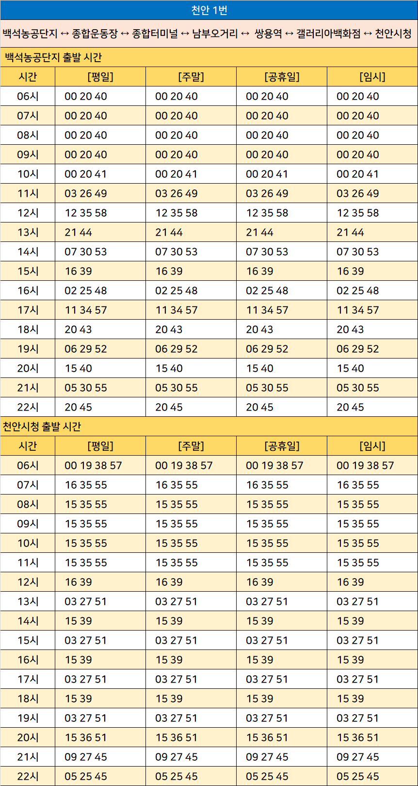 천안 1번: 백석농공단지 ↔ 종합운동장 ↔ 종합터미널 ↔ 남부오거리 ↔ 쌍용역 ↔ 갤러리아백화점 ↔ 천안시청