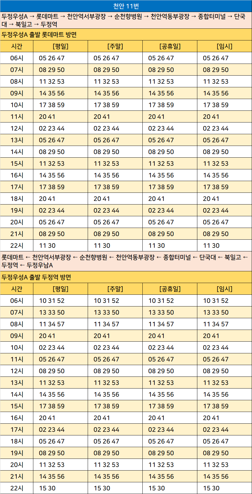 천안 11번: 두정우성A → 롯데마트 → 천안역서부광장 → 순천향병원 → 천안역동부광장 → 종합터미널 → 단국대 → 북일고 → 두정역 / 롯데마트 ← 천안역서부광장 ← 순천향병원 ← 천안역동부광장 ← 종합터미널 ← 단국대 ← 북일고 ← 두정역 ← 두정우남A